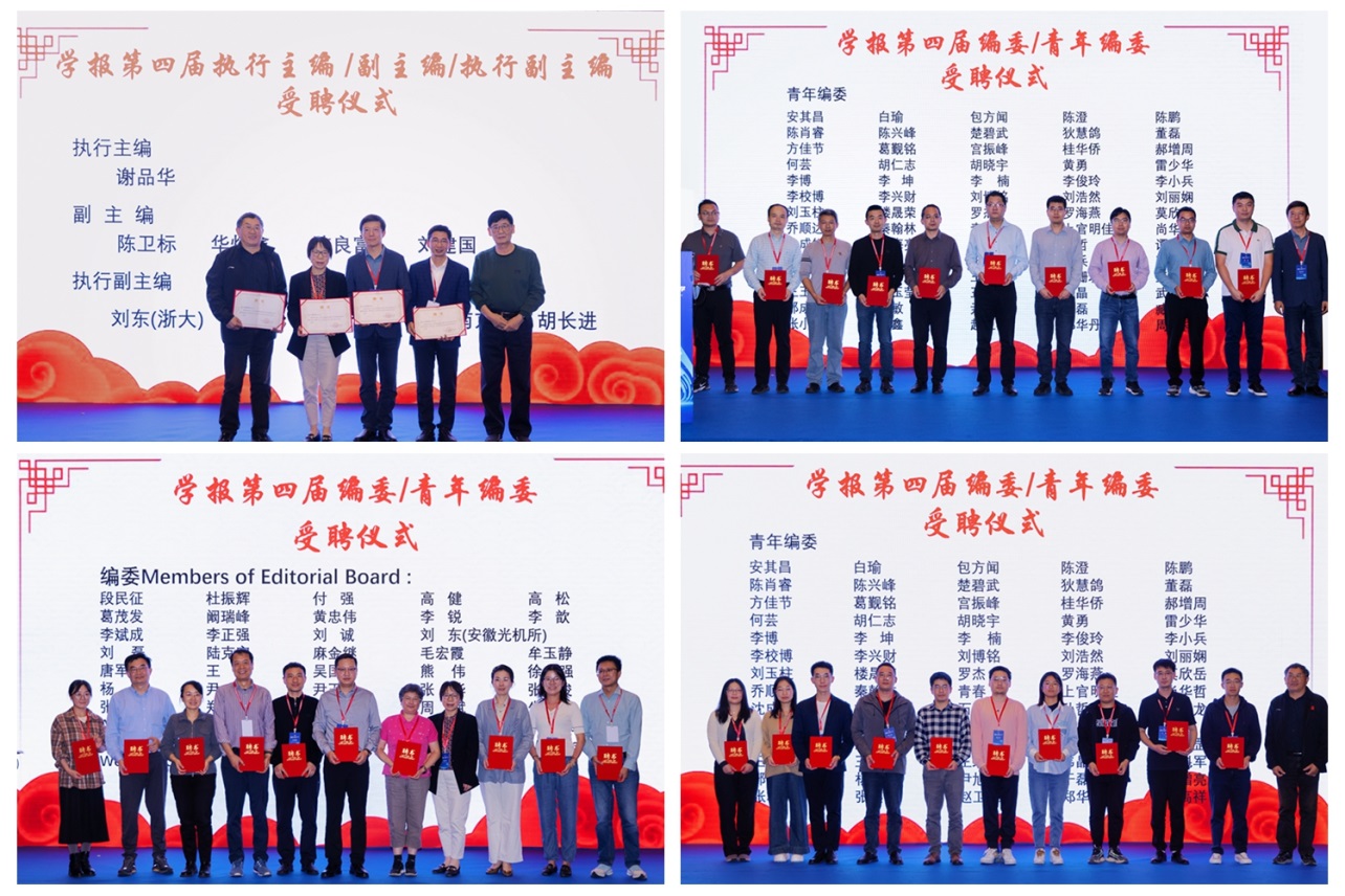 会议宣布,由龚知本院士、潘德炉院士、魏复盛院士、薛永祺院士担任顾问,刘文清院士担任主编,谢品华研究员担任执行主编,陈卫标研究员、华灯鑫教授、陈良富研究员、刘建国研究员担任副主编,刘东教授、吴松华教授、魏合理研究员、赵南京研究员、胡长进副研究员担任执行副主编,大气与环境光学研究领域不同科研院所、底蕴深厚的资深学者和大批充满创新活力的青年才俊组成的第四届编委会正式成立。会议对第三届优秀编委进行了表彰,并为新一届编委会成员颁发了受聘证书。