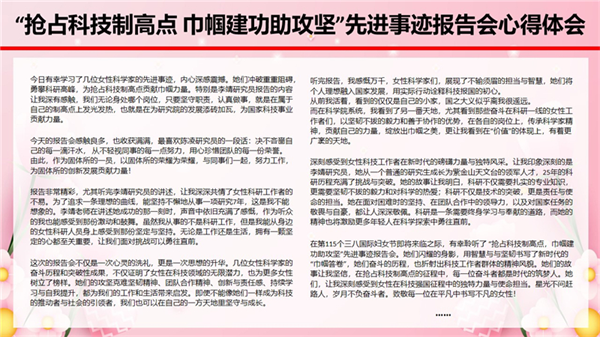 固体所组织女职工聆听了中国科学院妇工委、工会女工委举办的“抢占科技制高点 巾帼建功助攻坚”先进事迹报告会。全国三八红旗手、全国巾帼文明岗等获奖代表分享了她们攻坚克难、勇攀高峰的科研故事,展现了女性科技工作者的巾帼之力与巾帼之美。固体所女职工深受鼓舞,纷纷表示要以实际行动在科研岗位上发光发热,为国家科技事业添砖加瓦。