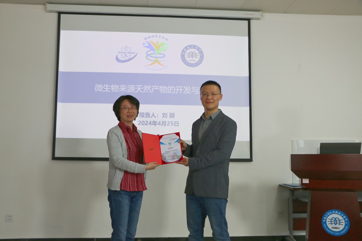 4月25日,强磁场青年论坛第44讲在交叉科研楼207会议室举行。活动邀请了强磁场中心磁共振生命科学部博士后刘颖为大家带来题为《微生物来源天然产物的开发与应用》的学术报告。中心党委书记许安、青年职工和学生参加了活动,活动由磁共振生命科学部副主任吴勃主持。