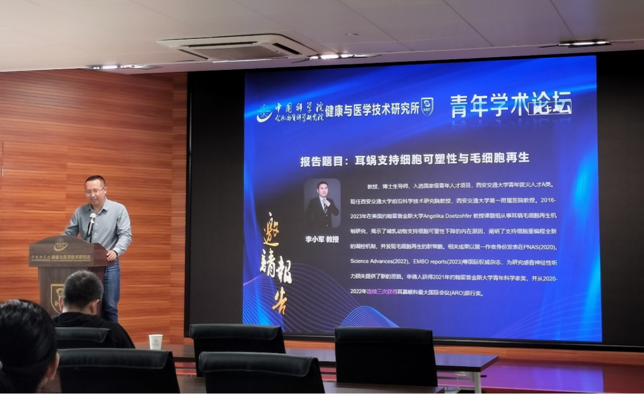 4月29日下午,中国科学院合肥物质院健康所举办第七期“青年学术论坛”,邀请西安交通大学前沿科学技术研究院李小军教授作题为《耳蜗支持细胞可塑性与毛细胞再生》的学术报告,所内青年科研组长、职工和研究生等50余人参加。会议由蒋远副研究员主持。