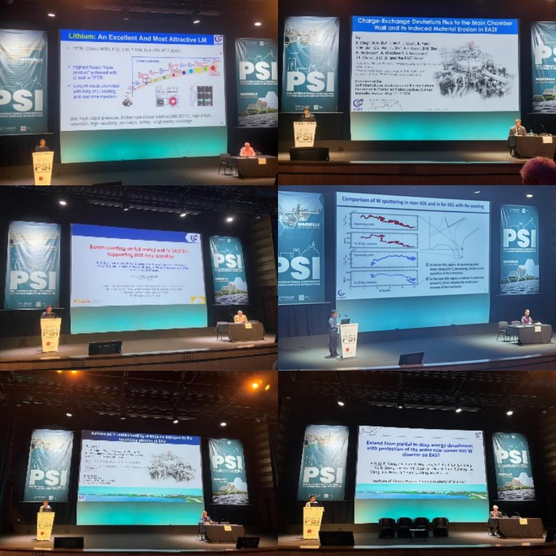 恰逢PSI大会50周年,主办方邀请了5位往届PSI专业委员会主席出席纪念活动,李建刚院士应邀远程参加,他作为第17届PSI专业委员会主席回顾了1998-2006年期间历届PSI会议取得的重要成果。本次会议中,胡建生研究员作综述报告,丁锐研究员、左桂忠研究员、徐国梁副研究员作邀请报告,丁芳副研究员、李克栋博士作口头报告,分别围绕液态金属在聚变装置中应用,中性粒子对第一壁材料腐蚀、EAST上硼化壁处理实验进展、钨杂质边界输运与屏蔽物理机制、偏滤器脱靶运行机制及其对芯部等离子体影响等热点问题,发表了多项重要研究成果。王亮研究员作为PSI国际专业委员会委员主持了1个分会。陈俊凌研究员、朱大焕研究员、鄢容研究员等现场展示了海报。