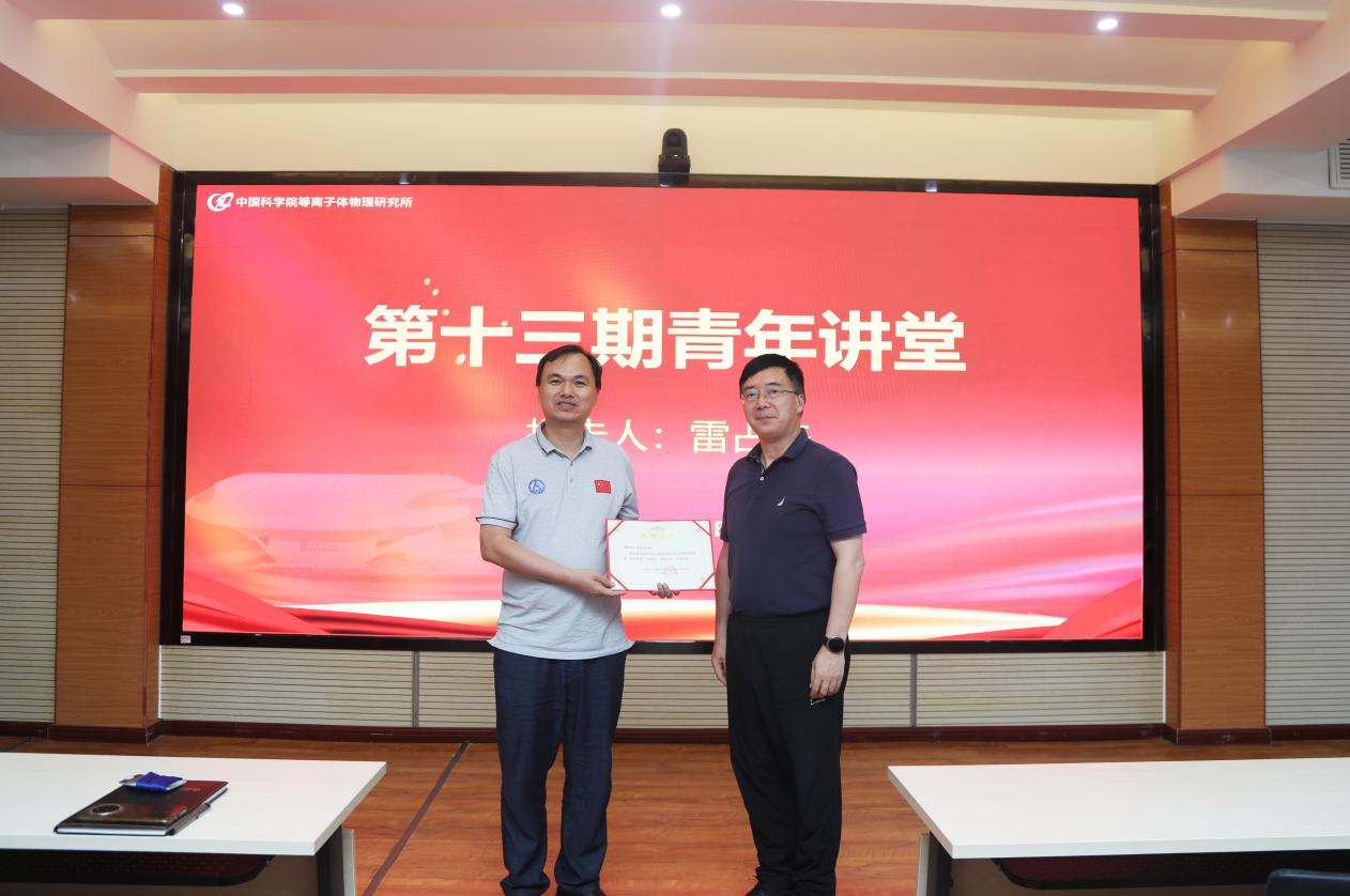6月25日,为深入学习宣传贯彻党的二十大精神,号召广大青年不负韶华,踔厉奋发,勇毅前行,展现新时代等离子体所青年职工和研究生蓬勃向上奋发有为的精神风貌,等离子体所团委特别邀请兰州空间技术物理研究所高级工程师雷占许作客ASIPP第十三期青年讲堂,带来题为“航天科技迈向高水平自立自强”报告,为广大师生员工科普航天知识,弘扬航天精神。党委书记吴新潮为雷占许颁发第13期ASIPP青年讲堂纪念证书,综合办主任黄素贞主持报告会。