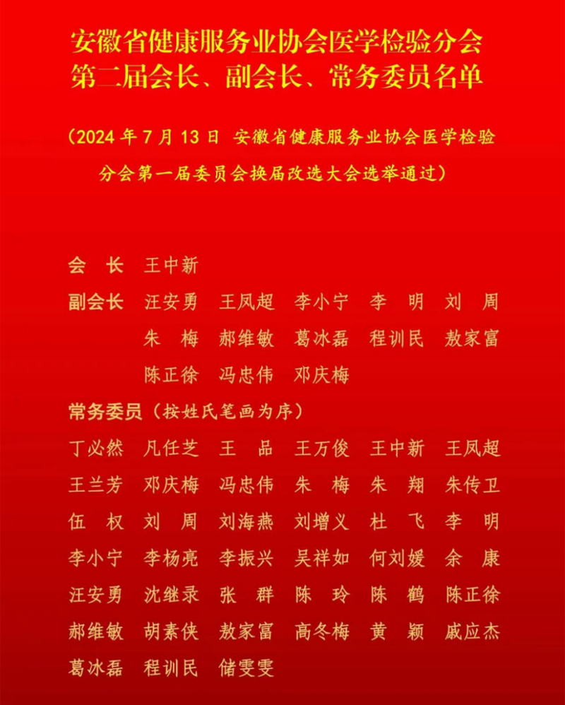 本次大会上,来自全省各级医院的检验科专家及业务骨干百余人参加了此次大会。大会依据协会章程和分会管理办法有关规定,通过民主投票方式,选举产生第二届医学检验分会会长、副会长、常务委员。分会委员125人中选举产生常务委员39人。王中新当选为分会第二届委员会会长,汪安勇、王凤超、李小宁、李明、刘周、朱梅、郝维敏、葛冰磊、程训民、敖家富、陈正徐、冯忠伟、邓庆梅当选为分会第二届副会长。