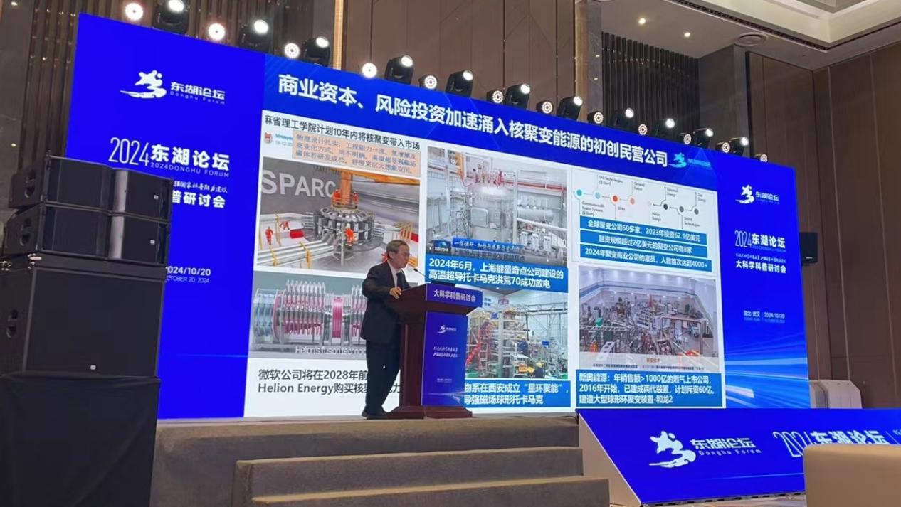 10月19日至21日,以“厚植科普沃土 放飞科学梦想——科普+光电子信息”为主题的2024东湖论坛在武汉光谷科技会展中心成功举办。全国政协副主席、台盟中央主席苏辉,湖北省委副书记、省长王忠林,中国工程院主席团名誉主席周济院士等出席开幕式。国家最高科技奖获得者、英雄航天员、知名院士专家、重点企业代表、学生代表等参会。合肥物质院等离子体所副所长徐国盛受邀参加东湖论坛“大科学”科普平行论坛做主旨报告并参加“大科学”科普研讨圆桌论坛。