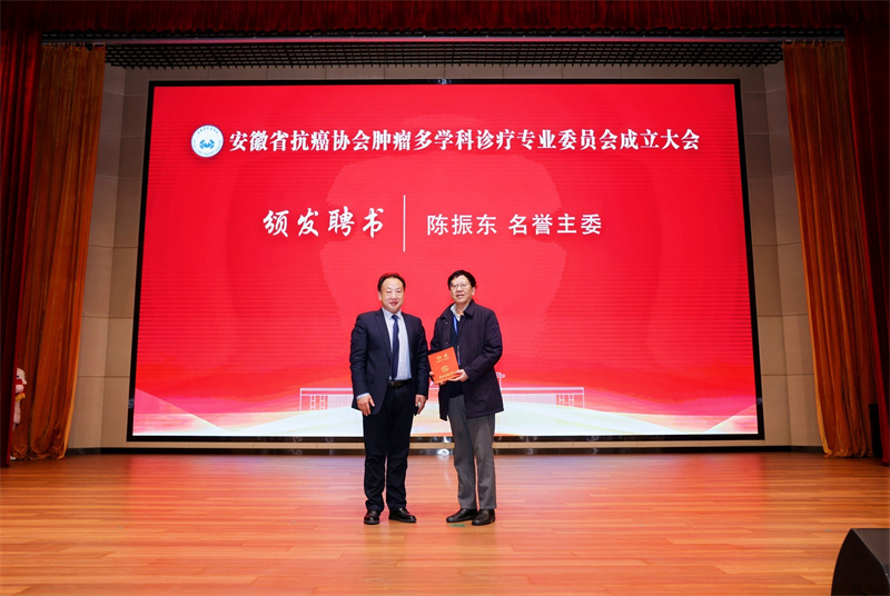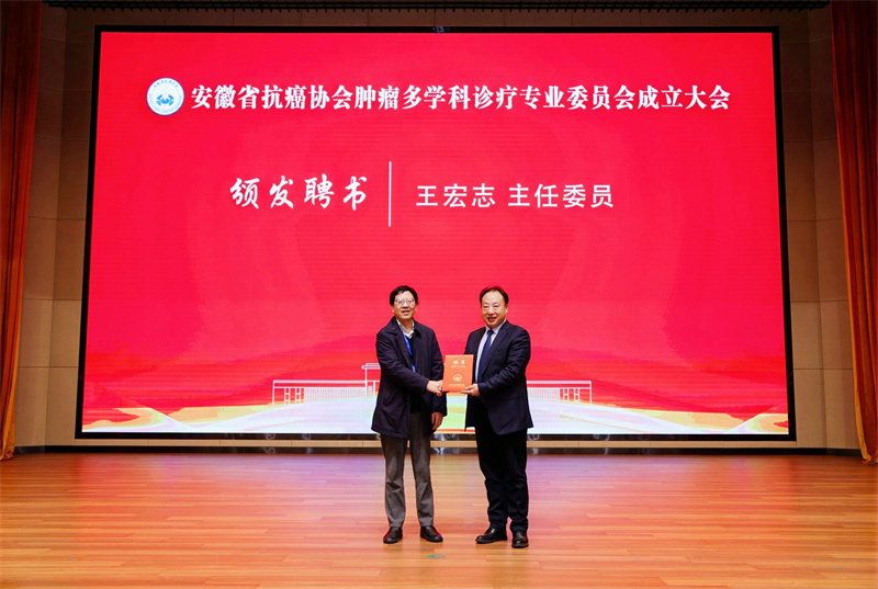 安徽省抗癌协会理事长陈振东为专委会主任委员王宏志颁发聘书