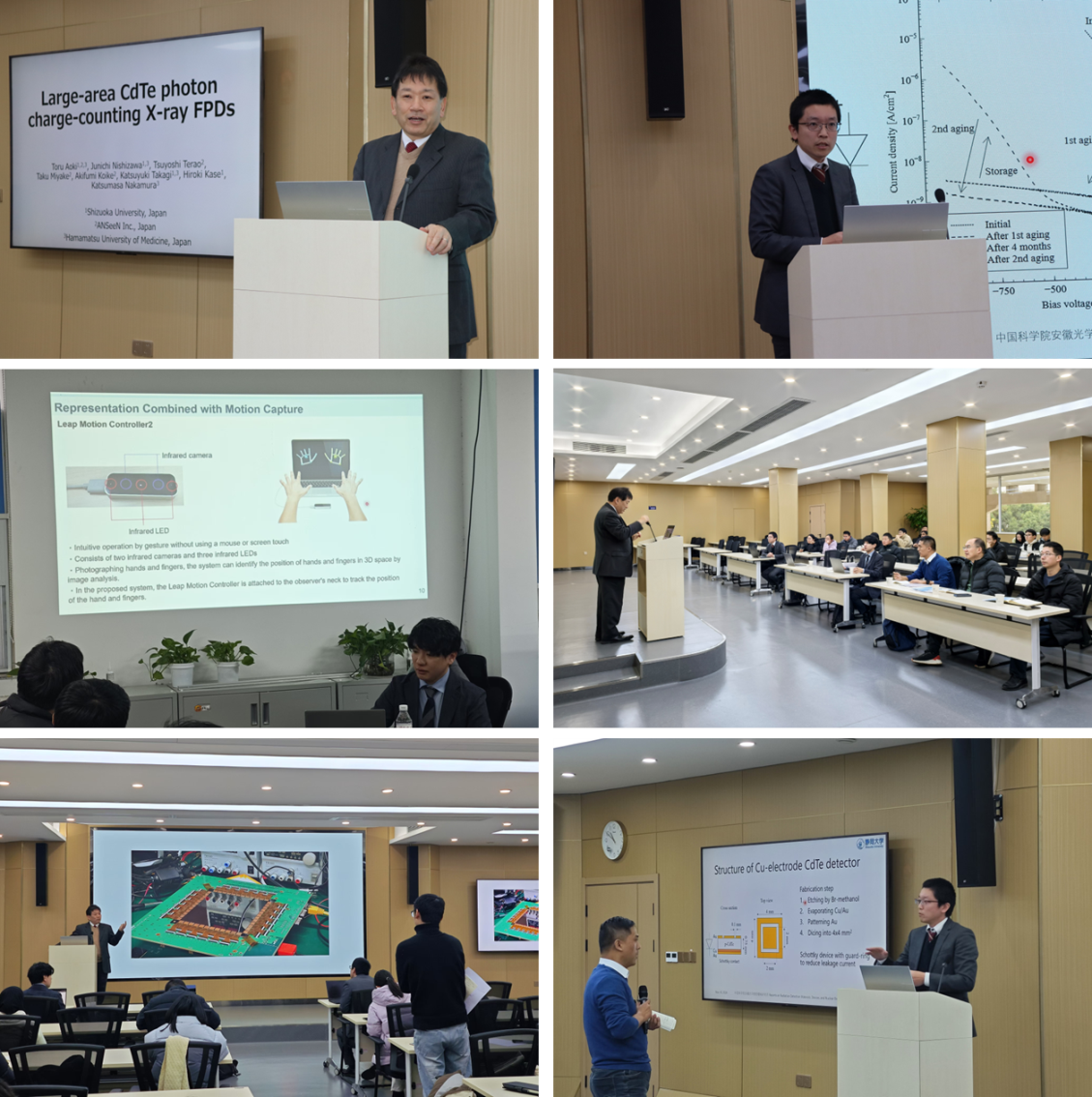 访问期间,青木徹教授、都木克之(Katsuyuki Takagi)副教授和加瀬裕貴(Hiroki Kase)助理教授分别做了题为“大面积CdTe光子计数X射线平板探测器”、“电学老化提升Cu/CdTe/Au探测器的整流特性”和“基于MR技术的光子计数CT 3D影像空间再现”的学术报告,介绍了日方团队在半导体辐射探测器件和光子计数辐射成像系统等方面的研究进展。相关科研人员和研究生聆听了报告并与日方专家进行了深入的交流探讨。