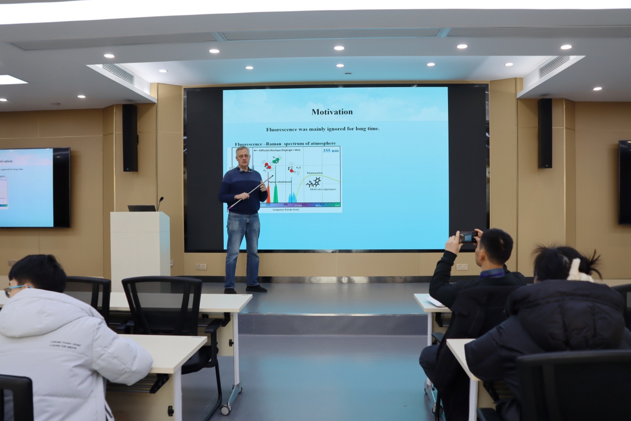 访问期间,Igor Veselovskiy 教授做了题为《基于米-拉曼-荧光激光雷达获取的大气气溶胶特征》的学术报告。报告主要介绍了激光与大气颗粒的相互作用所涉及的各种物理过程,详细报告了基于激光雷达荧光测量的气溶胶分类、荧光后向散射的退偏比分析、冰云内的气溶胶荧光特性、多通道荧光测量技术、气溶胶吸湿性对荧光的影响等米-拉曼散射和激光诱导荧光观测技术相关研究进展。与会科研人员听取了报告并进行研讨。