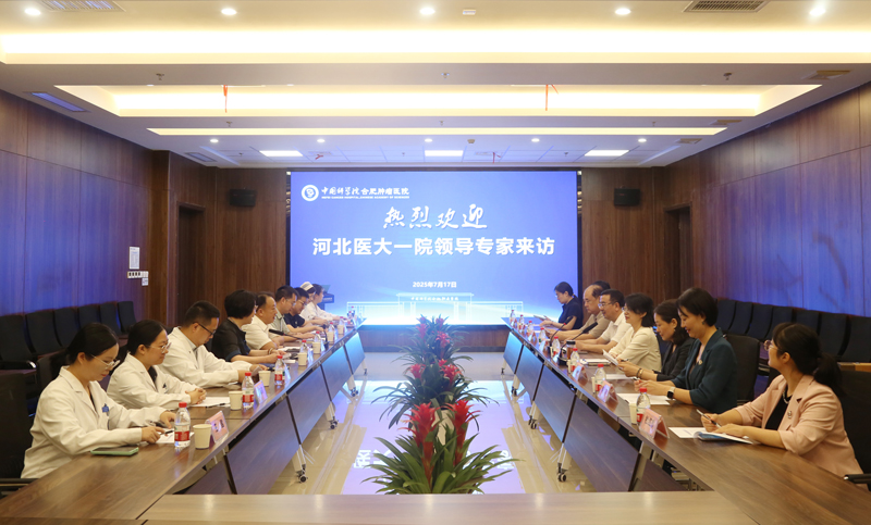 7月17日,河北医科大学第一医院党委副书记、院长乔治斌,党委委员、副院长赵媛媛等一行8人来访中国科学院合肥肿瘤医院,交流探讨肿瘤单病种多学科诊疗模式、多维度护理服务体系、肿瘤患者肠内整体营养管理等建设情况,中国科学院合肥物质院健康所党委书记、肿瘤医院院长王宏志接待了乔治斌院长一行。