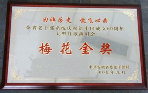 由合肥研究院老年大学选送的歌手张建平通过预选、复赛于9月26日下午,在安徽大剧院“安徽省老干部系统庆祝新中国成立60周年大型红歌演唱会总决赛”中,发挥出色,以总分97.40的高分荣获“梅花金奖”。