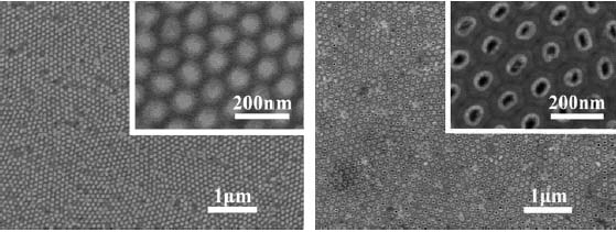 Ni纳米点(左)与Bi纳米环(右)扫描电镜照片