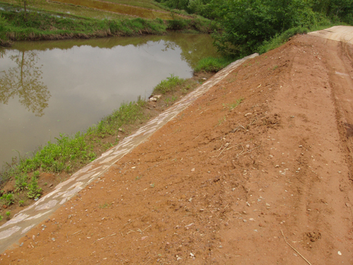 又是一段水毁道路!村里重新修起了路基,但是没钱铺水泥路面了。