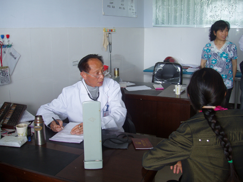 村民正在进行一年一次的体检,观察室里还有几位病员在输液。