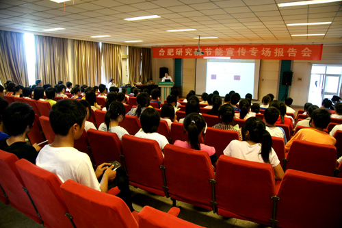 节能宣传周期间,围绕“节能攻坚、全民行动”的主题,研究院以弘扬环保理念、普及节能知识为抓手,以团员、青年为骨干,人人为节能减排作贡献为宗旨开展了一系列宣传教育活动。网络是当今最受欢迎的信息传播渠道,研究院在第一时间在主页上开辟了“节能攻坚、全民行动”专题,宣传节能知识,发布活动信息,报道相关进展,引起了大家的关注,也吸引了越来越多的人参与到活动中来;“低碳生活、绿色能源”主题展是活动周的重点之一,以“节能小窍门”、低碳生活、“绿色能源”、“世博会的节能建筑”等40多块制作精美的系列展板构成了科学岛中心广场一道独特的风景;为配合节能活动的开展,研究院特别邀请了有关商家上门进行节能灯的推广和介绍,将节能的理念渗透到家庭和社区;清洁能源(核能、太阳能电池)研究是合肥研究院重点学科方向之一,利用学科优势,组织了新能源专场报告会,中科院院新型薄膜太阳电池重点实验室潘旭博士为学生们介绍了太阳能电池的原理及其应用,深受欢迎,170多人聆听了讲座。