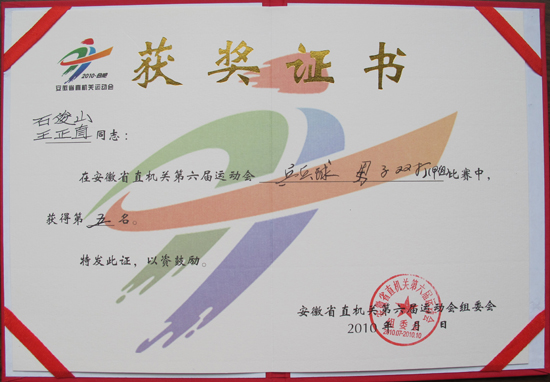 合肥研究院陈莉在领导干部组的女子单打比赛中技战术对头,敢打敢拼,一路过关斩将,最终拿下领导干部组桂冠。研究院的男子团体在整个比赛过程表现得极为顽强,他们在小组赛中首场失利后,及时调整心态,一场比一场打得好,以小组第二出线;进入淘汰赛后又力克另一组的小组第一名,挺进十六强。储昭琴在女子单打比赛中,以稳健的防守、不屈的韧劲,连挫强手也进入了十六强。石俊山和王正直组成的男双在比赛中不畏强手,互相鼓励,巧妙地相互创造杀球机会,连连获胜,顺利闯进前八。之后的比赛过程跌宕起伏,扣人心弦。在八进四时,他们被刚从省乒乓球队退役的选手击败,他们迅速摆脱失利的阴影,再胜一场,确定了第五、六名的位置。在争夺第五名的决赛中,他们碰到一对有专业背景的选手。其中一局他们以五比十落后,但他们没有放弃,一分一分地咬,一分一分地追,终于啃下了这一局,最终获得了第五名的好成绩,这也是合肥研究院男子乒乓球代表队在省直机关历届乒乓球比赛中获得的最好成绩。