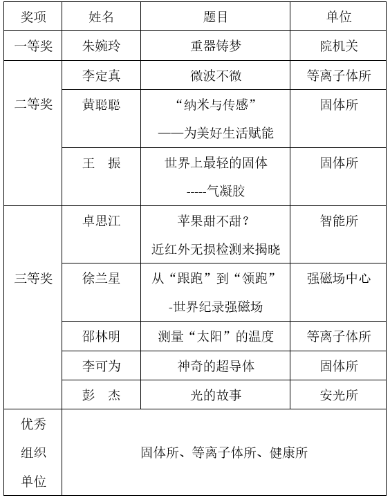 通过举办科普讲解比赛,选拔和培养了一批优秀科普人才,为合肥物质院的科普事业输入新的血液,推动了科普进校园及科普文章创作的工作进展。