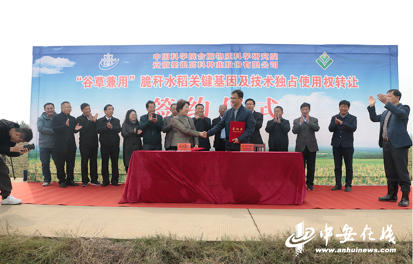 当日,中国科学院合肥物质科学研究院与安徽荃银高科种业股份有限公司,就“谷草兼用”脆秆水稻关键基因及技术转让进行了签约。这意味着,“科脆粳1号”等创新品种,将很快走出试验田,展开规模化种植,进而走向市场。签约现场,中国科学院院士、植物遗传育种学家谢华安也专程前来见证,“‘科脆粳1号’等新品种,将对农业科学发展,对种业工程发展起到极大推动作用。”谢华安说。