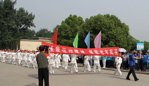 上午8:30,“科学岛之春”运动开幕式在2号楼北广场上准时进行,彩球飘舞、人声鼎沸。14支运动员代表队依次入场,走在最后穿白色太极服和着红色T恤的代表队是离退休代表队。当他们举着“扬我运动精神,展我老年风采”横幅和彩旗、迈着矫健步伐昂首阔步走过主席台时,迎来了全场运动员的雷鸣般的掌声。穿白色太极服的为开幕式表演队员,着红色T恤的是参加老年运动集体项目的运动员。