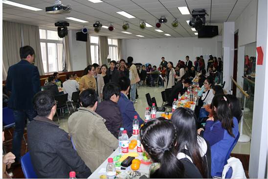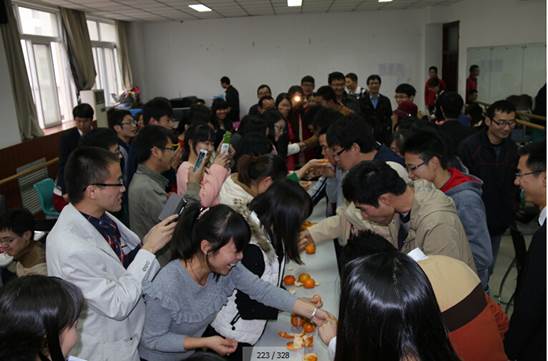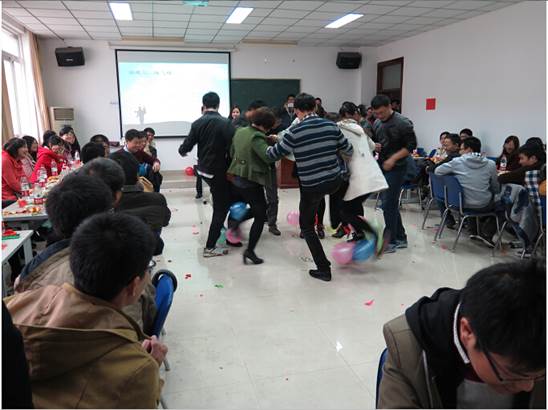 尽管天公不作美,15日飘起了丝丝小雨,但挡不住的是年轻人如冬日暖阳般的热情。大家自发结伴坐公交而来,活动未开始,三河两个教室就已经热闹非凡。为了缓和初次见面的羞涩,促进大家相互认识,活动以 “记名字”小竞赛拉开序幕,不到5分钟,会场气氛就热烈了起来。第二个项目“驿站传书”不仅考验每个人的理解能力和肢体表达能力,也在大家开动脑筋的无意间消除紧张心理,拉近人与人之间的距离。“翩翩起舞”、“挤眉弄眼”这些词语现场生动的肢体演绎让大家哄堂大笑。主持人趁热打铁,用“踩气球”和“合力剥橘子”等协作性强的活动项目将现场气氛推向高潮。“踩气球”需要男生保护自己组的女生脚上绑的气球不被别组男生踩破,活动设计初衷是给男青年们展示绅士风度和男子汉气概的机会,在保护弱者的同时还要有争取胜利的能力。而“合力剥桔子”要求每组出一男一女两名成员,一人一只手剥橘子并喂给男生吃掉。几轮游戏下来,大家不论男女已是打成一片。而在“合力剥桔子”环节输了的组,需要选择一种惩罚措施。一名男生选择了“表白三次被拒绝”的惩罚,面对前两名表白对象的“拒绝”,与他同来的好友挺身而出,帮助他“表白成功”。而在另一个活动现场,一名男生在选择了同样的惩罚项目时,一名女生主动要求代替他接受惩罚,并主动向来自固体物理所的男主持人表白。在她的带领下,先后有3名女生向男主持深情告白,可见合肥科学院青年学子的受欢迎程度和现代女性巾帼不让须眉的霸气。