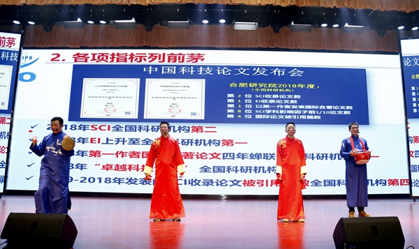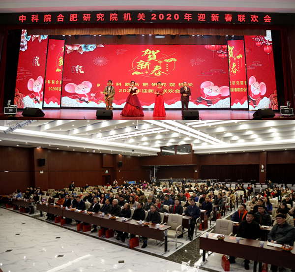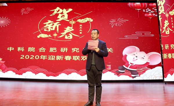 研究院院长刘建国为联欢会致辞,他简单梳理了研究院一年的工作成绩,介绍了2019年的工作亮点,对全体职工的辛勤工作表示感谢,并为大家送上了新年祝福。党委书记黄晨光宣读获得2019年优秀及良好称号的研究所和机关处室,刘建国上台为其颁奖。刘建国宣读合肥研究院党建述职结果通报暨先进基层党委纪委表彰,黄晨光上台为其颁奖。