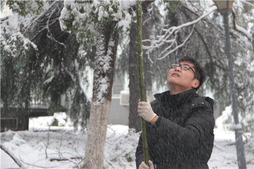 为了方便大家出行,保护科学岛园林景观,全体职工发扬团结和公益精神,在所领导带领下,组成铲雪护林小分队,连续两天清雪铲冰,自发打响抗击冰雪“保卫战”。安光所在综合楼工作的老师和同学也与大家并肩作战,合扫门前雪。大家或手拿铁锹、或手拿扫帚,先铲起紧紧冻在一起的坚硬雪块,再把雪块拢成一堆,然后细心地刮净路面残留的坚冰,露出平整的路面。为避免树木枝桠被压断,大家找来高竹竿,仔细寻找“不堪重负”的树枝,小心翼翼用竹竿打落积雪,给樟树“松绑”。