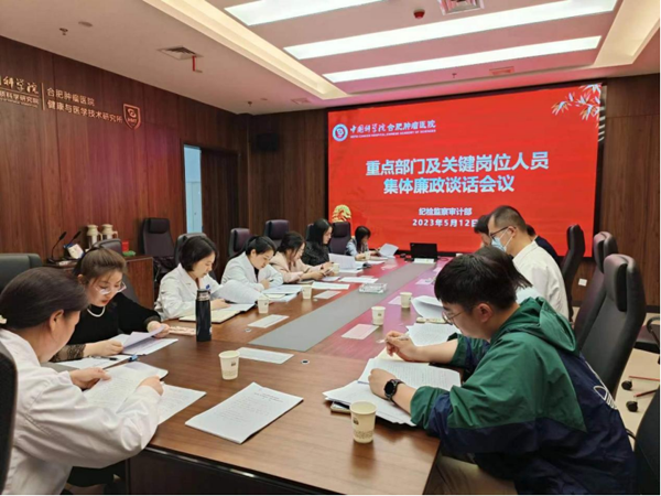 为加强对医院重点领域关键岗位人员的监督,进一步增强重点部门和关键岗位人员廉洁自律的主动性和自觉性,5月12日下午,中国科学院合肥肿瘤医院召开重点部门及关键岗位人员集体廉政谈话会议。健康所纪检委员、医院副院长史秀翠参加会议。