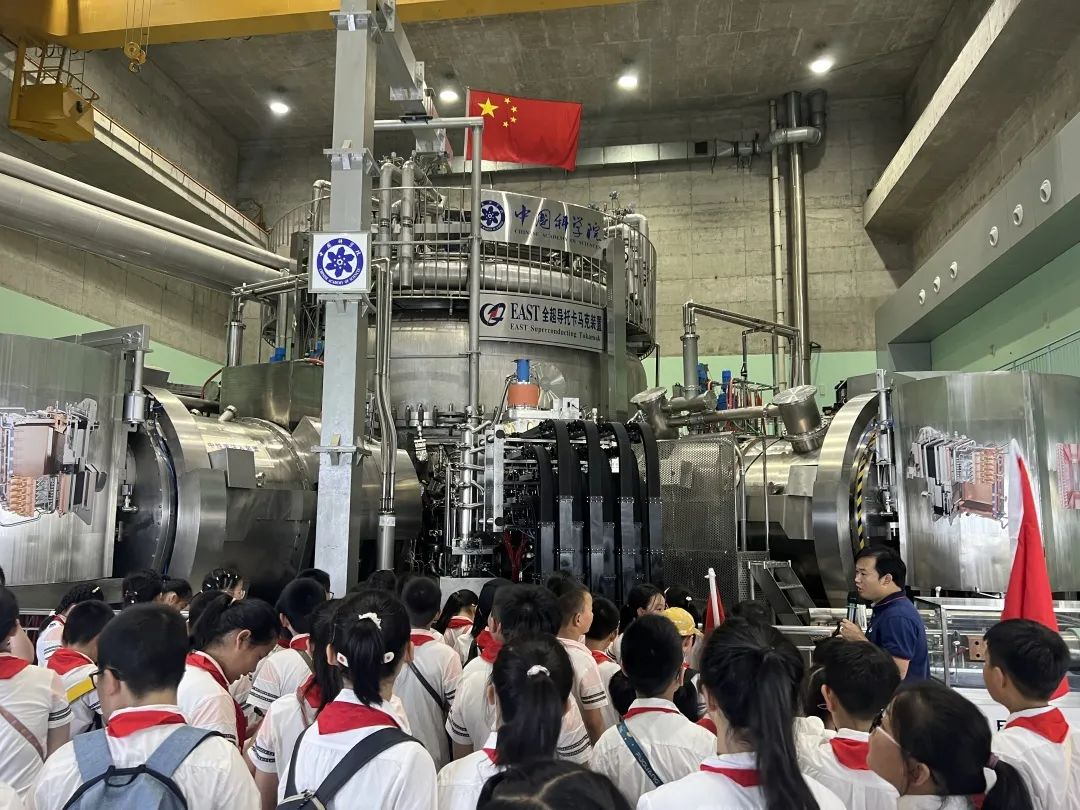 活动现场,庐阳区海棠街道“庐小志”代表、校外辅导员代表、长江路第三小学海棠花园校区四(6)中队科创小队,亳州路小学四(4)中队的少先队员们,实地参观全超导托卡马克EAST装置和聚变堆主机关键系统综合研究设施。孩子们近距离观察“人造太阳”装置,现场聆听讲解。“什么是核聚变?”“为什么要研发核聚变能源?”“核聚变的前景如何”……科普讲解员们用深入浅出、通俗易懂的语言徐徐描绘,孩子们踊跃提问,现场洋溢着浓厚的科学气氛。