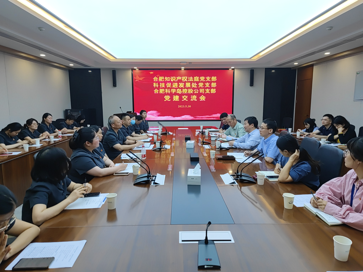 为深入贯彻学习习近平新时代中国特色社会主义思想,构建“互相促进、共同提高”的党建工作新格局,5月30日下午,合肥物质院科技促进发展处党支部、合肥科学岛控股公司党支部与合肥知识产权法庭党支部联合开展党建活动。合肥市中级人民法院副院长、合肥知识产权法庭庭长张勇等20余人参加党建活动,合肥物质院副院长宋云涛出席党建交流座谈会。座谈会由科技促进发展处副处长邓九安主持。