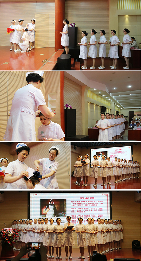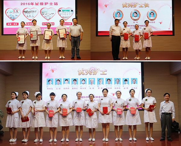 会上,医院分别对2016年度“星级护士站”、“优秀护士长”、“优秀护士”进行了表彰,星级护士站代表王秀敏、优秀护士长代表陈露、优秀护士代表刘文仙分别作为获奖代表发言。护理部还为我院今年刚入职的新护士安排了庄严的授帽仪式和宣誓仪式,26名新护士在南丁格尔肖像的见证下,手捧烛台依次行礼,接受护理部主任徐晓玫亲手戴上的神圣燕尾帽,完成自己护理生涯中难忘的一刻。