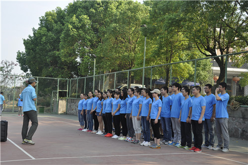 早晨6:40分,两辆巴士前后而行从固体所小楼出发,四十分钟后,参训队员到达紫蓬山训练基地。9月的早晨,天气微凉,这里山水环绕,空气宜人,让人不自觉地舒适与放松,在培训师指令的引导下,45名队员统一着装,分列站队集合在拓展基地,45人分成4支队伍,队名依次为“团火队”、“霸王队”、“飞翔队”和“战火队”。既然是团队协作,队员之间的熟悉性与默契度对今天的拓展活动至关重要,经验丰富的教练也首先以游戏的形式为4支队伍进行了团队建设,建立了团队中的核心领导,加深各个成员之间的熟悉程度,普及了素质拓展训练中经常使用的各个暗号。轻松愉悦的破冰环节,充分调动了大家的积极性。互动项目中落后的队员给大家带来了才艺表演,在轻松愉悦的氛围中,老师与同学们都渐渐打开心扉,不再拘谨和内敛,可以开怀大笑,可以夸张表演。“硫酸河”项目既考验智慧,又考验团队协作,11个人共用6块砖到达“河对岸”,一块砖上平均要站三到四只脚,为了保证平衡不落水,队伍中的每个成员都要采取搂抱式,排头排尾的成员还要不断蹲起捡砖递砖,一场游戏下来,人人汗流浃背,可脸上都是欣喜,因为不论名次,团队成员之间相互照顾,相互信任,互不埋怨——凝聚力是大家共同的宝贵财富。