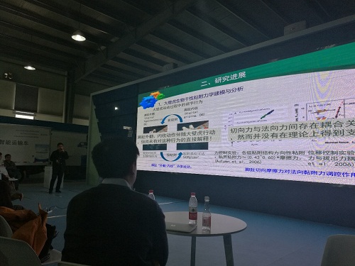 研讨会期间,吴晅在大会上作了题为“生物攀爬附着机理与仿生爬壁机器人研究”的学术报告。之后进行的大赛分为竞速组、创新组和投放组。竞速组以软体机器人在指定场地上的爬行竞速与障碍躲避为形式,考察软体机器人设计水平。创新组通过口头介绍或实物展示,进行创新柔性机构设计与应用考察。投放组则通过命令无人机抓取与投放指定水中目标,考察抓取/投放结构设计与操纵水平。在创新组比赛中,先进制造所张亚男、马刚等人进行了仿生爪刺抓附式爬壁机器人演示。机器人在演示中实现了陡峭壁面灵活攀爬,引起了在场观众的强烈兴趣,赢得了在座评委一致好评,并最终获得该组一等奖。