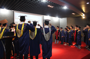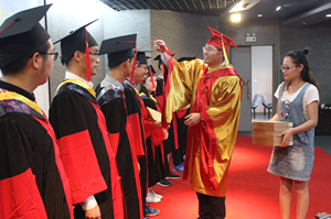 闫超老师宣读毕业生名单,应用技术所所长田兴友老师为同学们扶正流苏并颁发毕业生纪念册。学生代表张昭带领毕业生宣读毕业誓词,他们庄严宣誓:“绝不浪费生命的每一分钟,不断完善自己,努力做最好的自己,为祖国富强和人民幸福奋斗终身!”