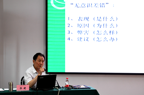 张建以“你准备好了么”、“你够优秀么”两个问题开场,以机关干部工作中的“无意识差错”表现为主线,结合多年的工作实践经验,从他总结的《机关行为36忌》中挑选了“没有没有”、“毕事不回复”、“拖拉误事”、“逻辑不清”、“视而不见”、“文稿露怯”、“不沟通”、“没有说法”等禁忌为主题,阐述其表现、产生原因、弊害及建议,又从心理学、管理学等专业角度进行了详细讲解。张建在报告中指出,行为主要表现在仪容仪表、言谈举止、思想作风和能力水平四个方面,最终归结于如何做人做事,做人做事的最重要规则是“守正”。机关工作中的这些无意识差错,如果不及时察觉并改正,不仅仅会影响个人职业发展,还会对单位形象及社会造成极大的负面影响。