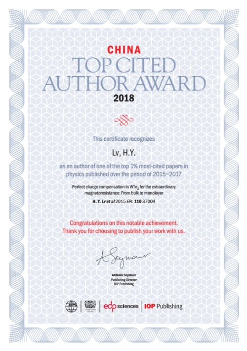 英国物理学会根据权威网站Web of Science的引用记录,对过去三年(2015-2017)在IOP上发表的各领域文章进行统计,对被引用次数在前1%的论文作者授予该奖项。吕红艳副研究员在IOP旗下欧洲物理快报(EPL)上发表的题为“Perfect charge compensation in WTe2 for the extraordinary magnetoresistance: From bulk to monolayer”的文章(EPL 110,37004 (2015))获此奖项。