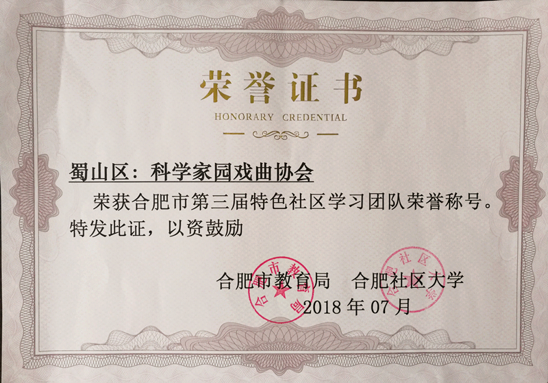 4月15日,合肥市教育局和合肥社区大学联合为研究院老年戏曲协会颁发了2018年“合肥市特色社区学习团队”的荣誉称号。这是继2017年获得“合肥市优秀学习团队”以来该协会第二次获得此类荣誉。