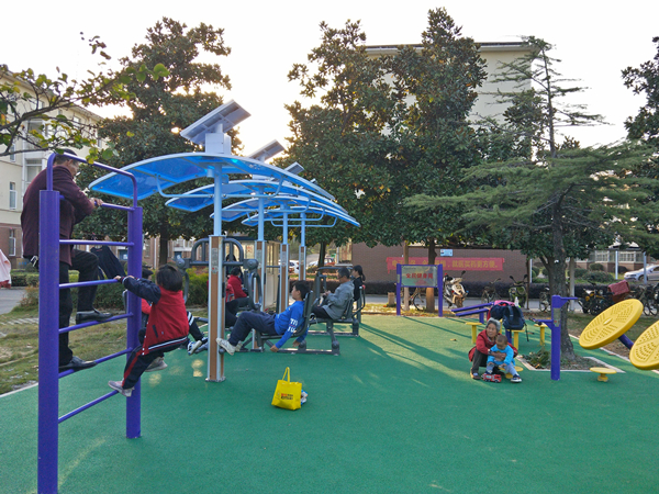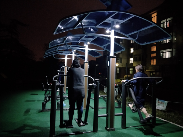 此次设置的健身器械除了传统的象棋棋盘、仰卧起做、双人扭腰器等,还增加双位背部训练器、双位太空漫步机、双位蹬力器、双位划船器,这些器械配备了电子智能屏幕,具有记录运动时间、消耗热量、运动频率、运动次数等功能,运动者可用微信扫描二维码连接手机,留下每次运动记录。此次场地还采用了太阳能储蓄电能设备,既节能环保又解决了居民夜晚无光运动。