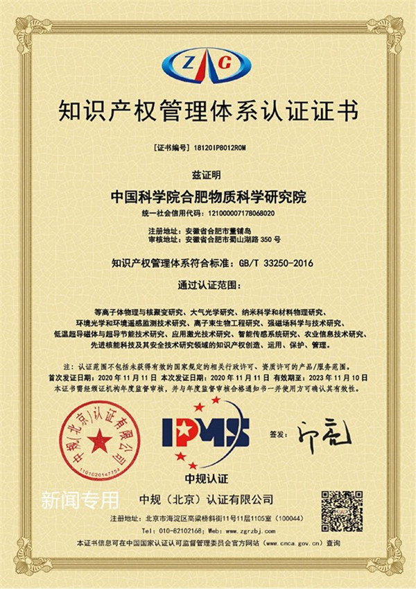 11月11日,中规(北京)认证有限公司向中国科学院合肥物质科学研究院签发了《知识产权管理体系认证证书》,认证符合《科研组织知识产权管理规范》(GB/T33250-2016)国家标准。