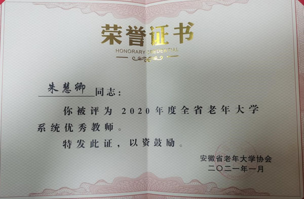 近期,安徽省老年大学协会印发《关于表彰全省老年大学系统2020年度优秀教师的决定》,并召开2020年全省老年大学工作会议。会议对136名教师授予“2020年度全省老年大学系统优秀教师”称号并进行了表彰。其中,中科院合肥研究院老年大学手工班老师、合肥研究院退休职工朱慧卿获此荣誉。