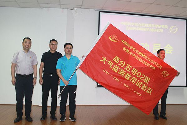 现场举行授旗仪式,刘建国将“中科院合肥研究院大气监测载荷试验队”红旗授予了高分五号02星大气监测载荷研制团队。