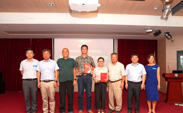 宋云涛(右)与曹京华(左)为固体所量子中心团队代表颁奖