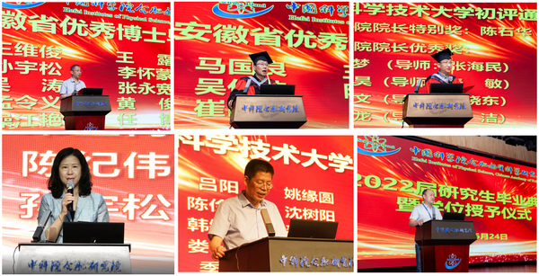 陈宗发宣读2022年度中国科学技术大优秀硕士毕业生名单并颁奖,程艳宣读2022年度中国科学技术大学优秀博士毕业生名单并颁奖,王俊峰宣读中国科学技术大学评审通过2022年中科院院长奖学金名单并颁发证书,吴海信宣读安徽省优秀硕士毕业生名单并颁奖,邹士平宣读安徽省优秀博士毕业生名单并颁奖。院所领导为2022届毕业生拨穗正冠、授予学位。毕业生向老师献上鲜花,表达谢意、分享喜悦。