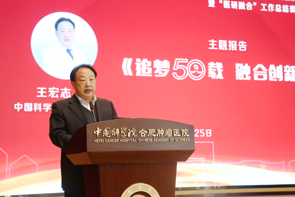 健康所党委书记、中科院合肥肿瘤医院院长王宏志作了题为《追梦五十载 融合创新篇》的报告。报告重温了医院自1972年建院以来,从医务室、职工医院到研究型三级肿瘤专科医院的蜕变,他把医院50年的发展和变迁历程比作“四渡蜀水”,一代又一代人医院人从中传承着巨大的精神力量;如今,医院要以建院50周年作为新的起点,立足新院区,牢牢坚持医院与健康所一体化发展的基本路线,全面推进医研融合创新,向着建设中科院特色、水平一流、研究型三级甲等肿瘤医院的奋斗目标迈进。