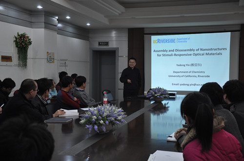 12月12日,应固体所青年联合会的邀请,美国加州大学河滨分校殷亚东教授作客第十四期学术论坛,并作了题为“受激响应纳米结构材料的组装与分离”(Assembly and Disassembly of Nanostructures for Stimuli-Responsive Material)的学术报告。固体所职工和研究生近百人参加了报告会。