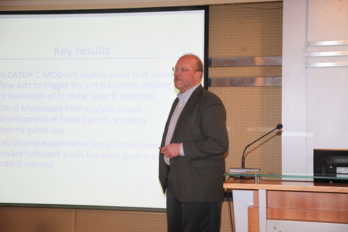 Tynan教授还与研究所科研人员及研究生进行了学术交流,带来题为“磁约束等离子体输运相关研究最近成果:高约束模转换,边界局域模控制和粒子箍缩”(Recent results on transport in confined plasmas: the H-mode transition, ELM control and particle pinches)的学术报告。该场报告会由徐国盛研究员主持。报告中,Tynan教授对其领导的研究组近期就磁约束等离子体中湍流和输运相关领域部分重要研究成果进行了概括和总结,主要包括以下三点:第一,美国ALCATOR C-MOD装置上高速相机相关测量,以及简化的“捕猎者-猎物”模型(predator-prey model)在定性上重现高约束模(H-mode)功率阈值对密度的定标关系等研究成果,它们对于进一步加深H-mode转换潜在物理机制具有重要意义;第二,通过在美国DIII-D实验装置开展的调制共振磁场扰动(M-RMP)研究,发现了与稳态共振磁场扰动(S-RMP)截然不同的实验结果,并且该结果与M-RMP放电状态下边界存在强烈的粒子向内箍缩现象有关;第三,圆柱位形实验室等离子体研究同样展示了湍流驱动粒子向内箍缩现象的存在,并且揭示了在磁约束等离子体中存在多通道自由能来源条件下向内箍缩现象的产生机制。