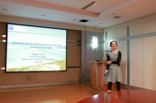 王红霞博士详细介绍了她在染料敏化太阳电池固态电解质材料(三维快速离子导体)、一维纳米材料(纳米棒阵列和纳米带)、电子传输背反应动力学等方面的研究成果。会上,王红霞博士还与在场科研人员就电池关键材料设计、电子传输微观特性表征方法等感兴趣的话题展开了深入交流。