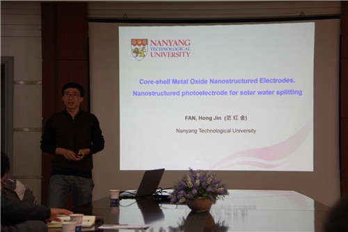 范红金的报告主要介绍了无机非金属材料(如金属氧化物、硫化物等)的纳米结构设计,以及将其应用于高性能的能量存储器件与光催化分解水体系等方面的研究。范红金博士介绍了其研究小组近期的一些工作,主要阐述了核壳纳米电极材料在超级电容器和锂离子电池中的应用,如在泡沫石墨烯表面生长V2O5纳米棒阵列作为锂离子电池正极材料,外层再包覆一层PEDOT后对材料电化学性能的影响;在泡沫石墨烯表面生长VO2纳米棒阵列后再包覆一层碳量子点作为锂离子电池正极材料等。随后结合实例,详细介绍了光电化学电极材料的可控合成,如CdSe量子点敏化的具有反蛋白石晶体结构的TiO2三维纳米材料,以及钙钛矿型太阳能电池在光催化分解水方面的应用。会后,与会者就各自感兴趣的问题与范红金博士展开了深入的交流讨论。