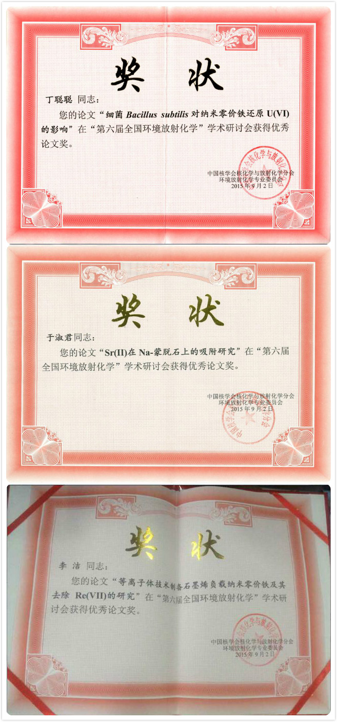 会议共收到论文216篇,邀请报告12个,口头报告113个,经过专家评审和口头报告评议,最终评选出优秀论文18篇。等离子体所三位博士生的论文荣获大会优秀论文奖,分别为丁聪聪的论文《细菌Bacillus subtilis对纳米零价铁还原U(VI)的影响》、于淑君的论文《Sr(II)在Na-蒙脱石上的吸附研究》以及李洁的论文《等离子体技术制备石墨烯负载纳米零价铁及其去除Re(VII)的研究》。
