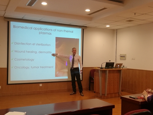 应用等离子体研究室陈长伦主任和程诚副研究员分别介绍了十一室的概况和十一室在低温等离子体处理癌细胞方面的研究进展。报告后,Rousseau教授和青年职工及学生针对感兴趣的研究领域进行了深入探讨和交流,他针对大家提出的疑问耐心解答,并结合自己的切身体会和科研工作积累,为大家提供了宝贵的经验和借鉴。