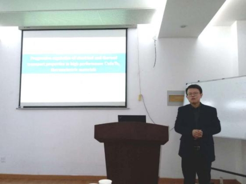 杨君友教授首先介绍了热电材料的研究背景。热电材料是一种基于赛贝克效应与帕尔帖效应从而实现电能与热能转换的半导体材料,在能源、航天、军事领域有着广泛的应用。杨君友课题组在P型CuInTe2 材料中尝试用p、Sb元素在Te位进行阴离子掺杂,从而提高了载流子浓度,使得电阻率有了较大幅度的降低,功率因子PF有了较大提升,其中CuInTe1.99Sb0.01在823k的条件下ZT值达到了1.13,相较于纯材料ZT提升了41%。此外,杨君友还通过在CuInTe2基体中引入ZnO纳米相并与基体发生了原位反应生成了In2O3纳米颗粒并均匀的分布在基体中,从而大大增强了声子的散射,降低了热导率,进一步提高了ZT值。会后杨君友与在场师生进行了深入交流。