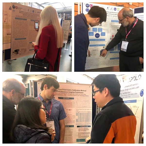 会议期间,安光所科研团队介绍了研究所近年来在大气偏振遥感探测技术方向的研究进展,袁银麟、提汝芳博士分别《高分五号卫星多角度偏振相机的偏振定标技术》和《基于多角度偏振相机数据的中国东部地区大气气溶胶光学厚度反演》学术报告,介绍了高分五号卫星DPC载荷的实验室辐射与偏振定标技术和定标结果,以及利用高分五号卫星DPC载荷数据研究大气气溶胶反演及应用进展,团队其他成员做了学术墙报展示,展示了高分五号卫星DPC载荷的实验室偏振定标技术、杂散光校正、在轨测试和基于DPC在轨观测数据的气溶胶反演应用等内容;同时还展示了大气同步校正仪、偏振扫描浊度计等偏振遥感仪器的研究成果。