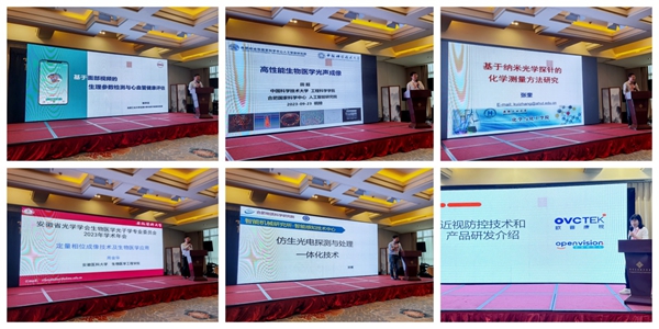 学术报告环节,合肥工业大学杨学志教授、中国科学技术大学田超教授、安徽工业大学张奎教授、安徽医科大学周金华教授、中国科学院合肥物质院智能所宋博研究员、欧普康视柳翠英主任,分别作了题为《基于面部视频的心血管生理信号检测》《高性能生物医学光声成像》《基于纳米光学探针的化学测量方法研究》《定量相位成像技术及生物医学应用》《仿生光电探测与处理一体化技术、《近视防控技术和产品研发》的大会特邀报告。专家们在报告中畅所欲言,充分展现了各自工作中的最新进展和学术成果,并就报告中的学术问题进行了积极探讨。